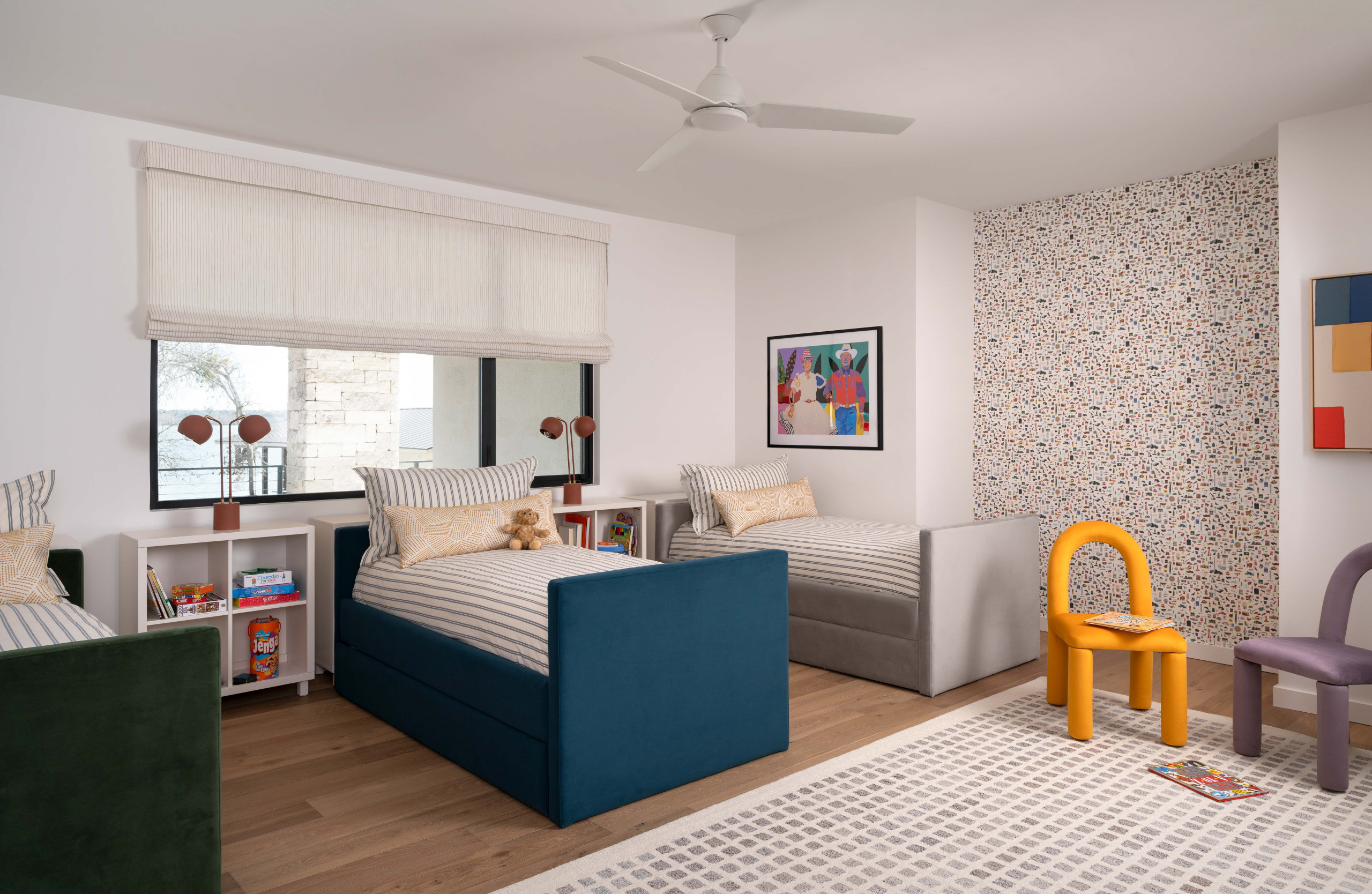 “One of the very first things the homeowners said they wanted in the house was a bunkroom,” Lindahl says. “Their friends next door have one and they figured all the kids will be back and forth for sleepovers.” Although this room doesn’t have bunk beds, it does have trundle beds, which likewise accommodate two kids each. The designer pulled the area rug back from the beds so as not to impede pulling out the trundles. “This created a playroom area on the rug,” she says.
