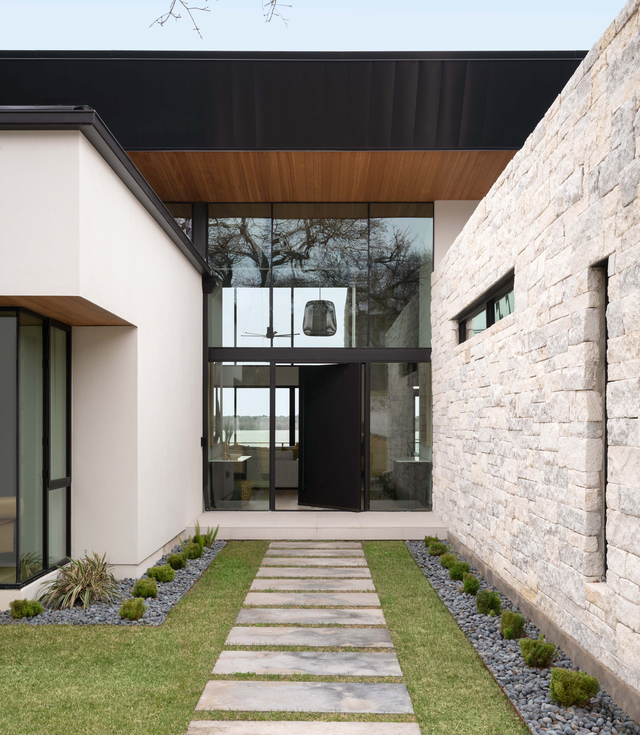 From the front walkway, two stories of glass around the front door reveal views through the house to the lake beyond. The large front door pivots on the right side.