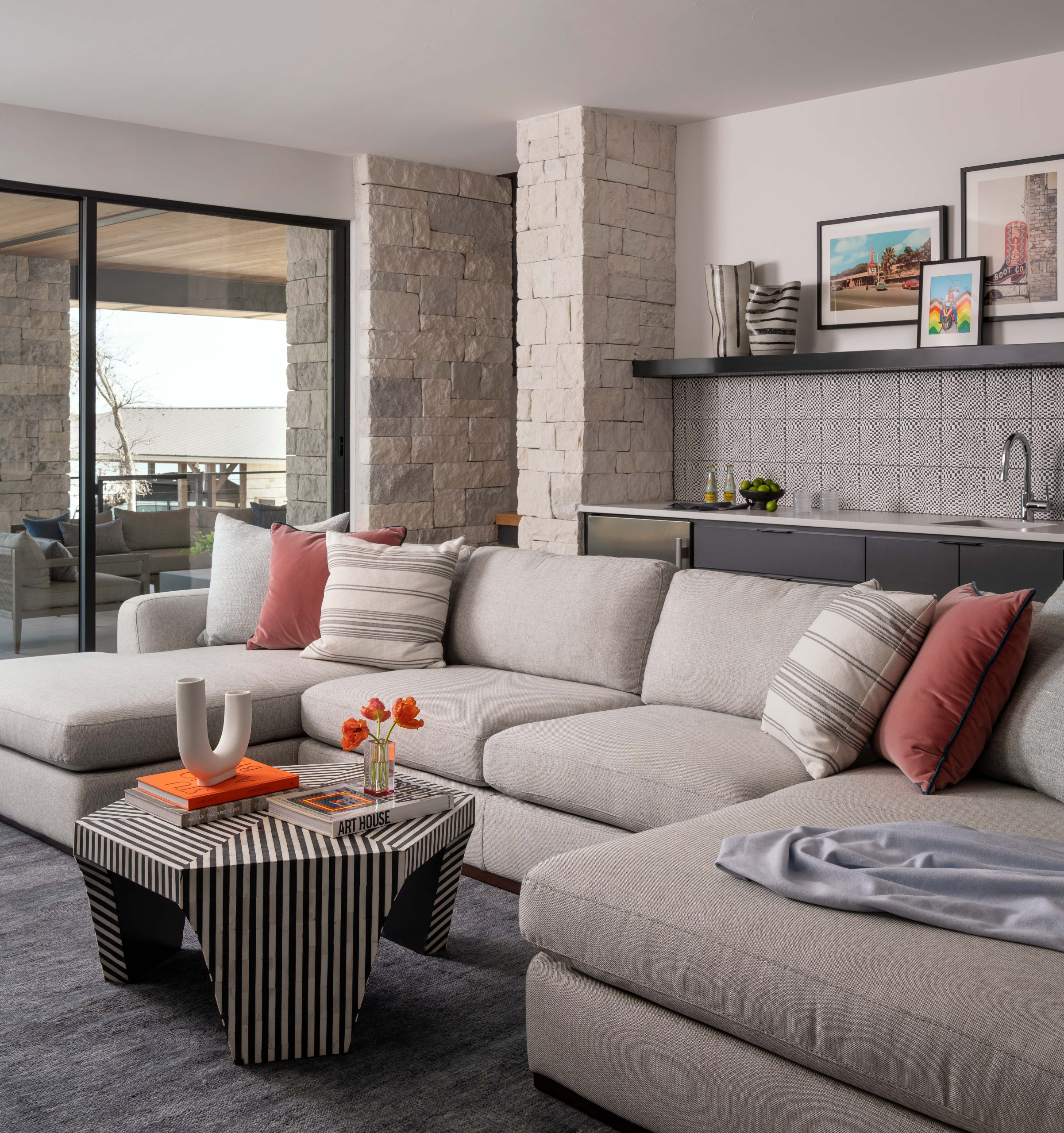 “We said we went a little ‘Beetlejuice-y’ in here,” Lindahl says. The playful black-and-white striped coffee table is bone inlay. Hammel picked up on that when choosing the funky vases on the bar shelves. The backsplash tile is encaustic and has a pattern with a lot of movement and a 3D quality.