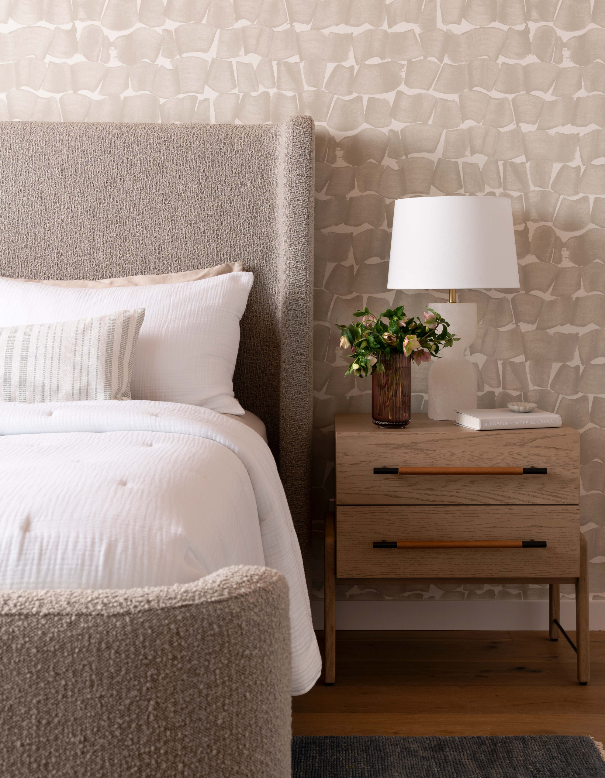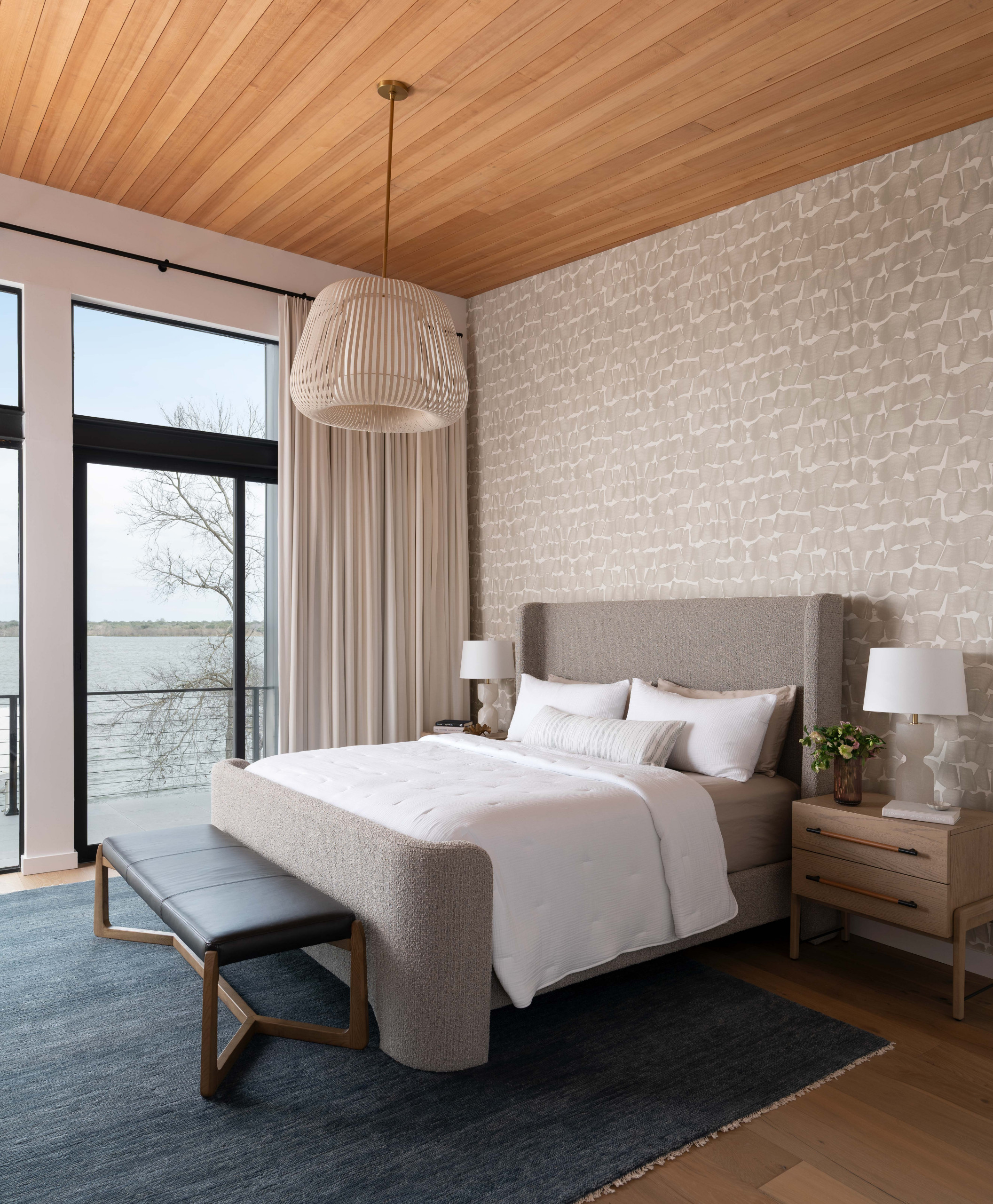 The primary bedroom is soft and serene. “The wife really wanted wallpaper on the headboard wall,” Lindahl says. “The husband loves blue, so we worked it in through the blue rug in here.”