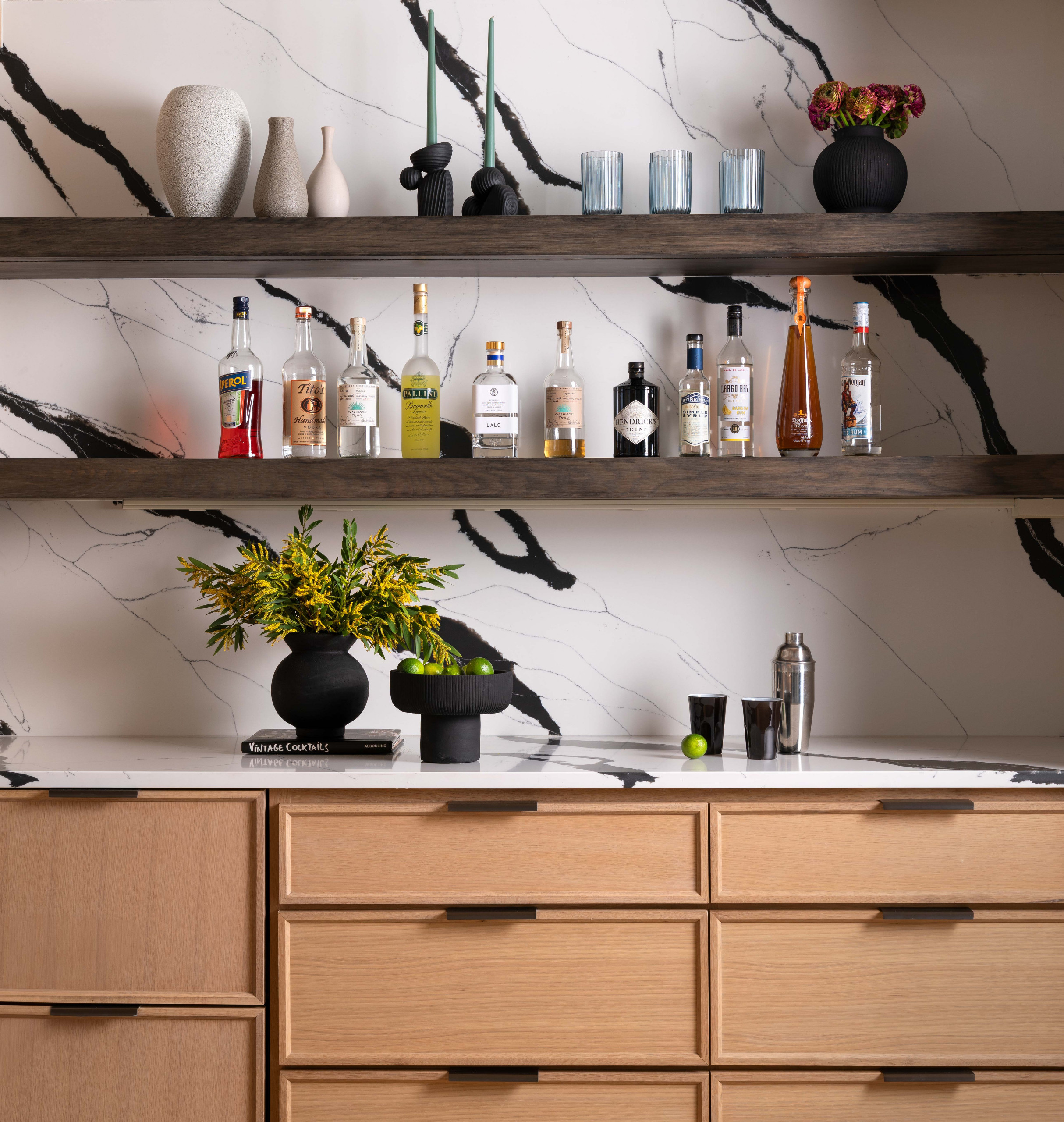 Originally designed as cabinetry, the fridge wall became a bar for entertaining at the request of the first owners, a decision the new owners embraced. Black-veined quartz counters make a bold statement. Lindahl recommended black island stools to echo the black veining.