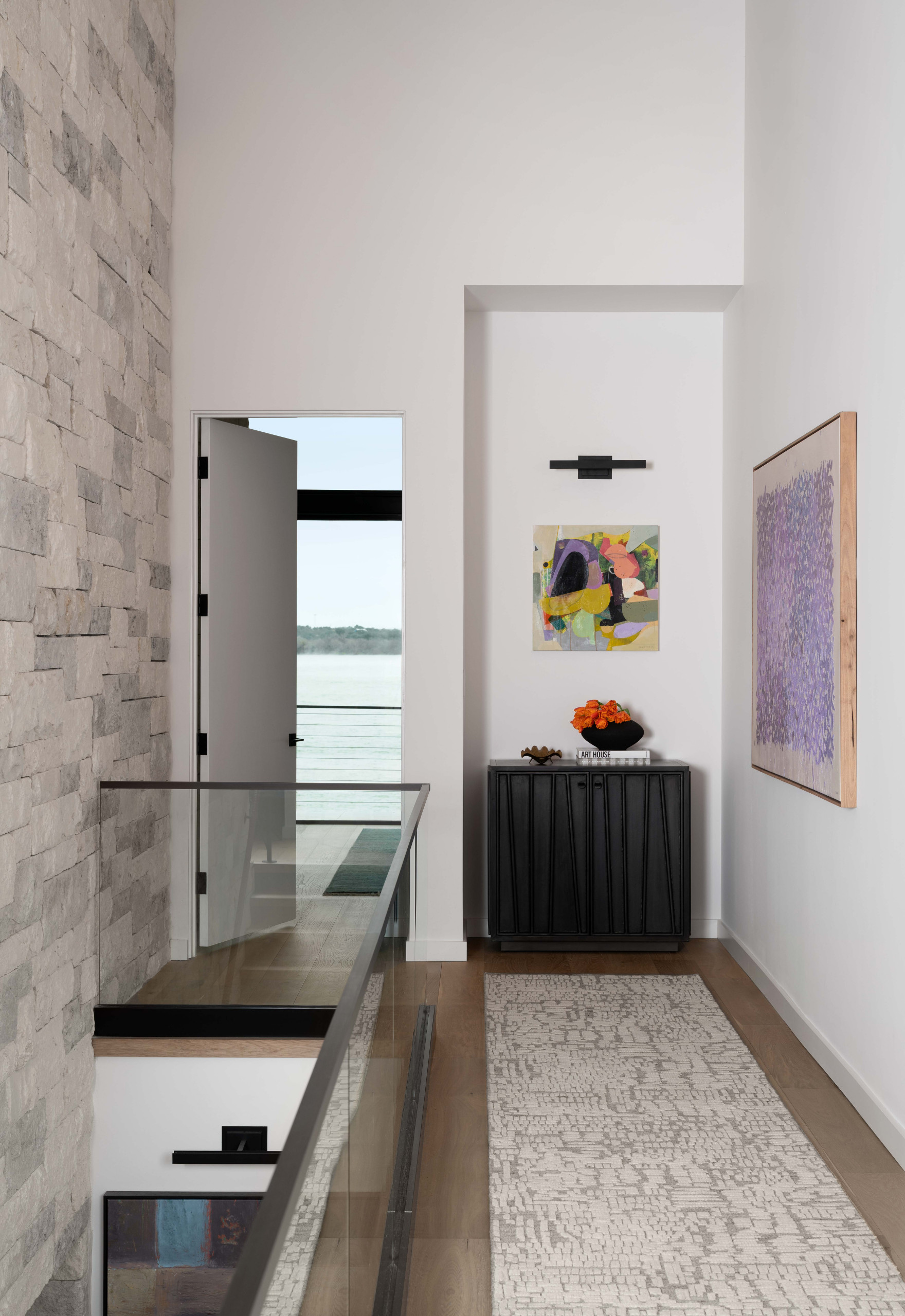 Etch began working with the original homeowners during the construction phase, helping select key finishes such as flooring, tile, countertops, cabinetry and lighting. The new homeowners purchased the house about two months before it was completed. After admiring Etch’s work online, they hired the team to help furnish the interior and layer in the final design elements — furniture, rugs, art and accessories — making some tweaks to tile and lighting along the way. The result is a warm contemporary home that’s family-friendly, with room for friends of all ages to have weekend fun at the lake.