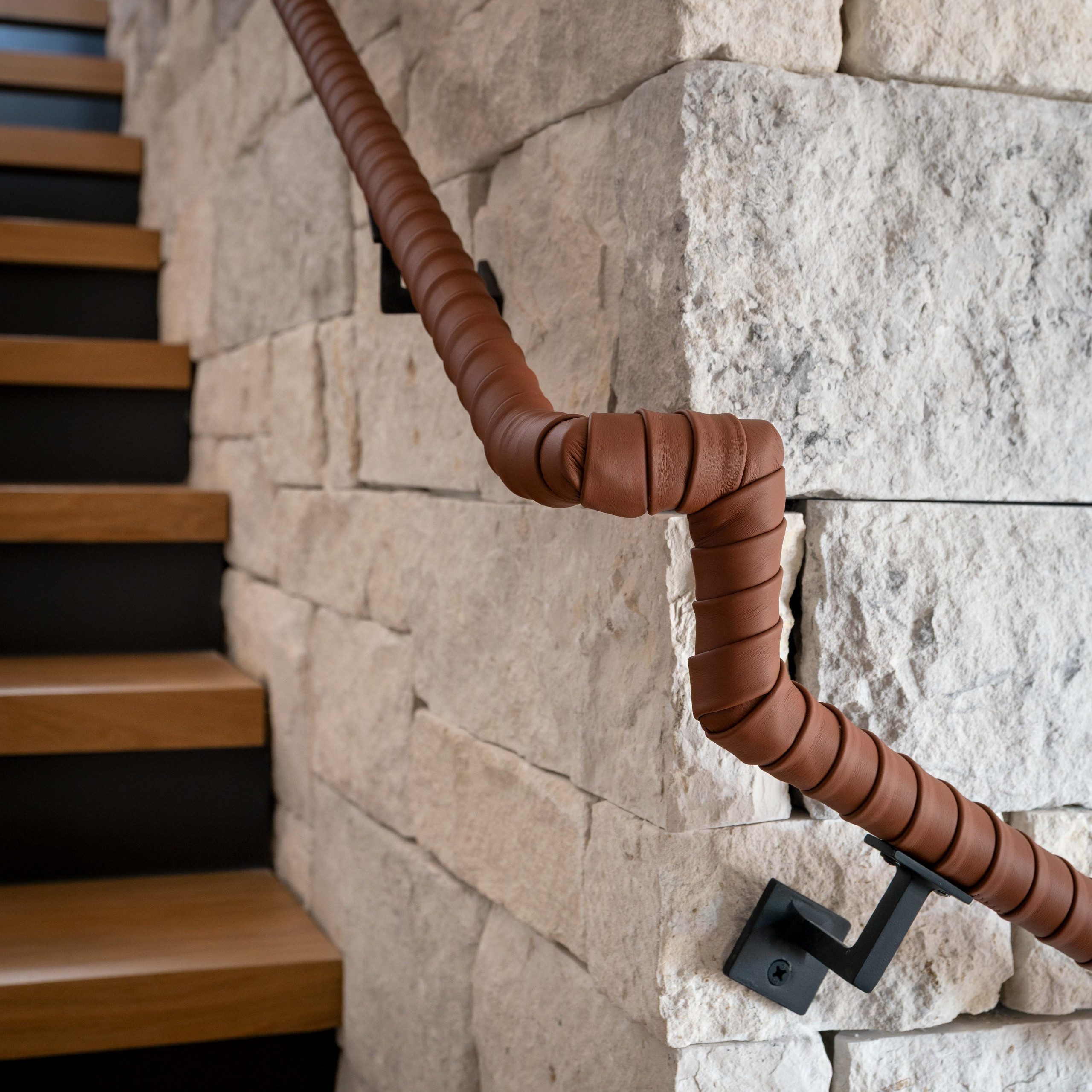 Lindahl repeated the leather-wrapped motif seen on the front door handle and nightstands on the stair handrail.