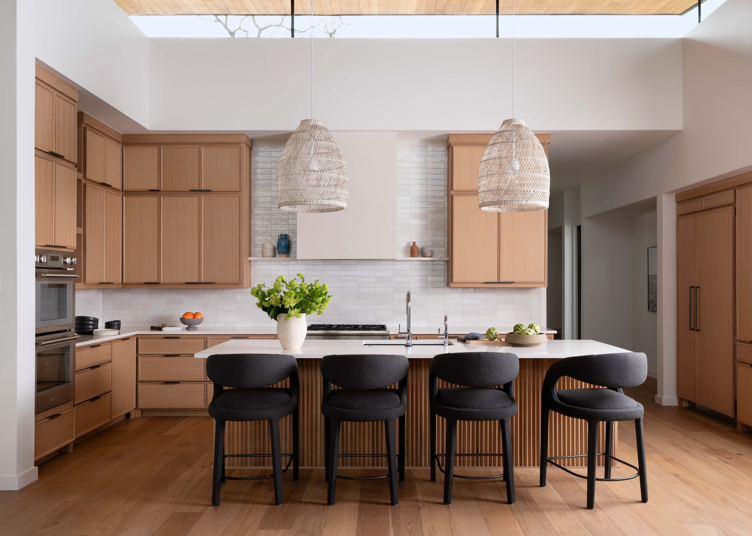 Open to the dining area, the kitchen offers lake views from the sink. The cabinets are rift-sawn white oak with skinny Shaker-style rails and a bevel detail. The island is reeded wood. Lindahl repeated reeded textures throughout the house. The backsplash is a zellige-look ceramic tile that brings creamy tones into the kitchen, and the countertops are plain white quartz.