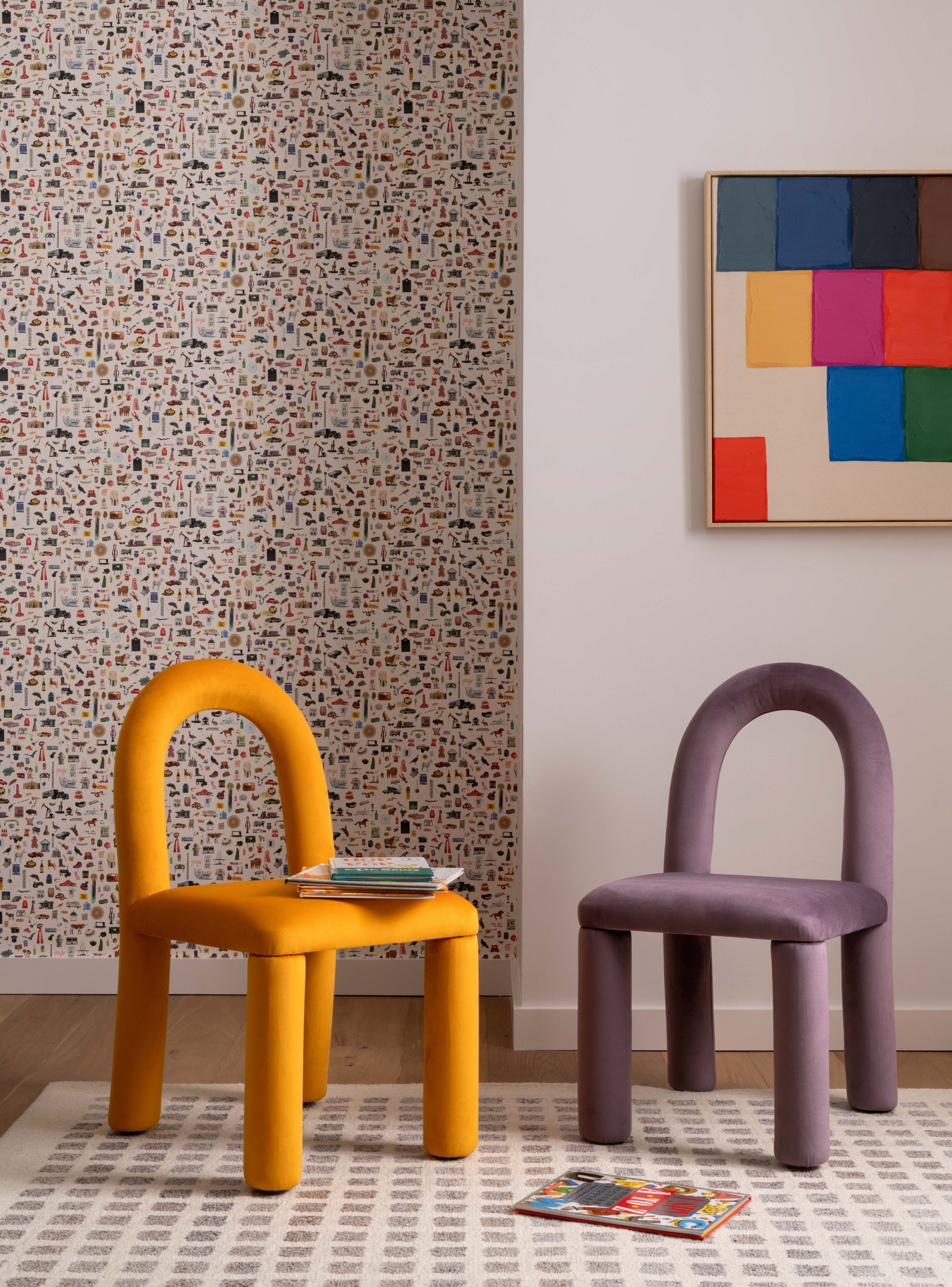 The colorful chairs are velvet and play off the colors in the artwork and wallpaper.