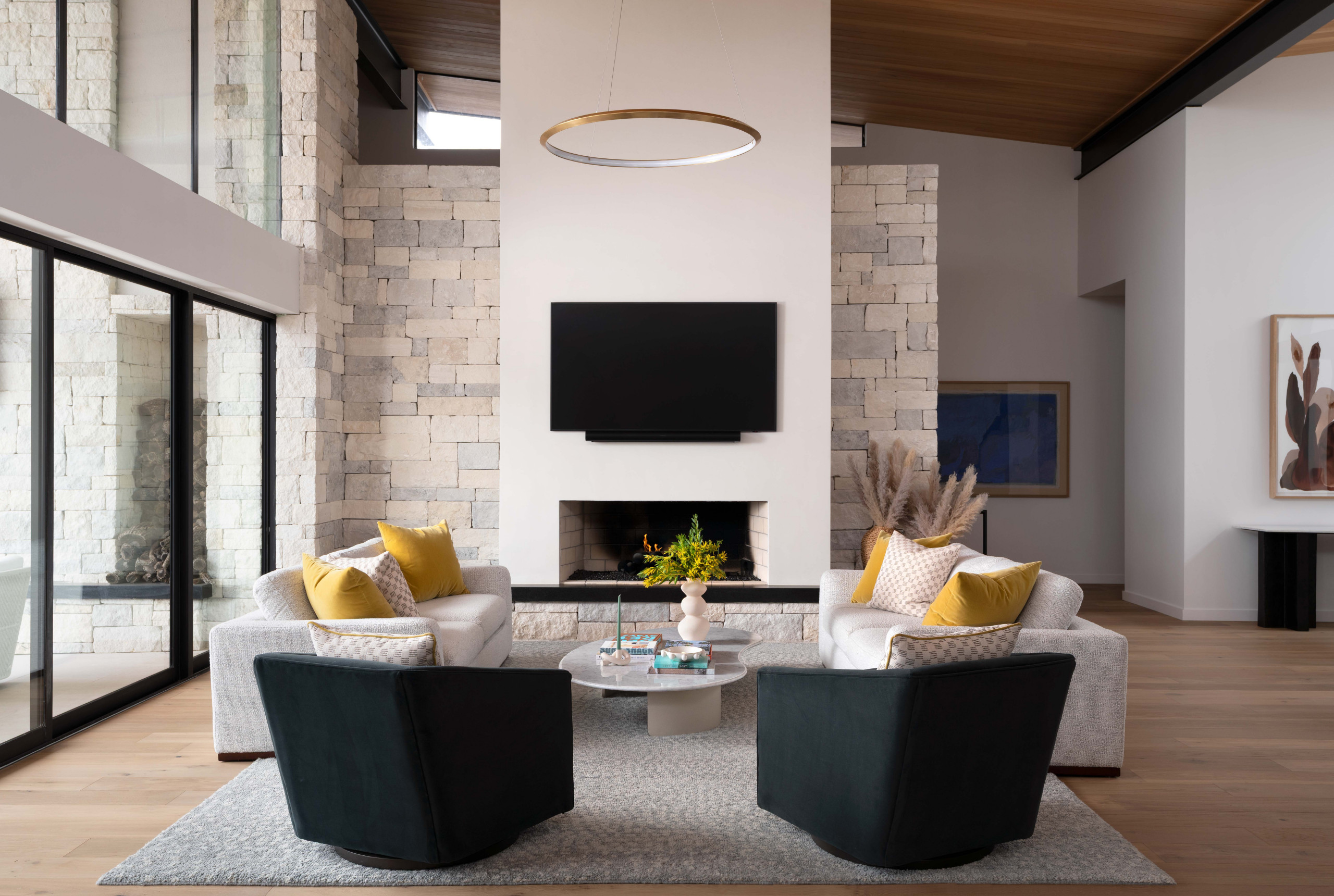 The entry opens directly into a living room anchored by a limestone fireplace wall that continues outside. “Our local limestone can skew kind of yellow, and we wanted something more neutral than that,” Lindahl says. “We helped the construction team cull through the stones on-site and select the ones that were more neutral for this wall. The fireplace surround has a plaster finish that adds softness through its texture.”
