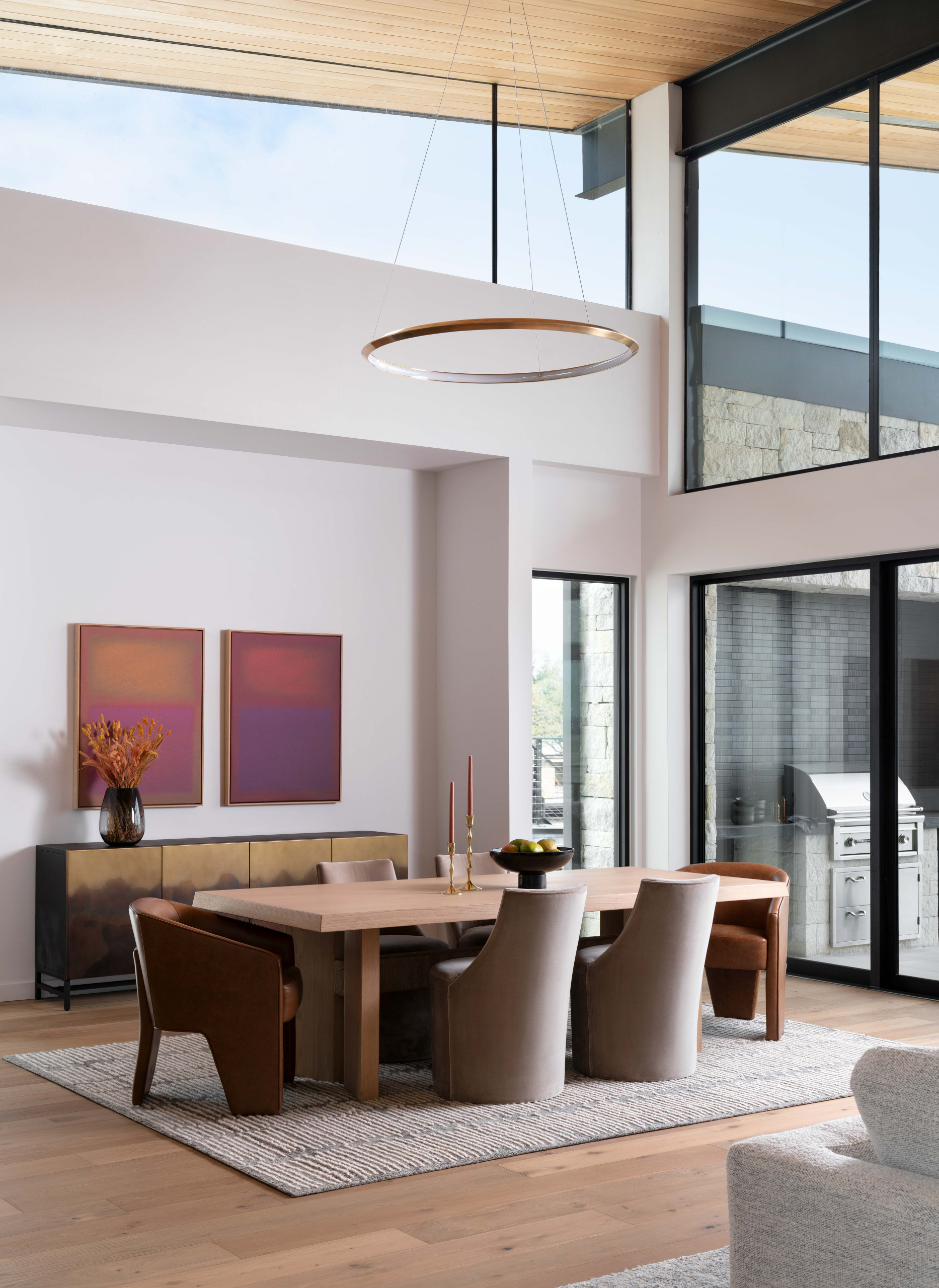 The dining room features the same ring chandelier as the living room. “I love the way the two light fixtures echo each other,” Lindahl says. “They are clean and simple. There is brass on the outside and the lights are inside, which provides really nice ambient light.”