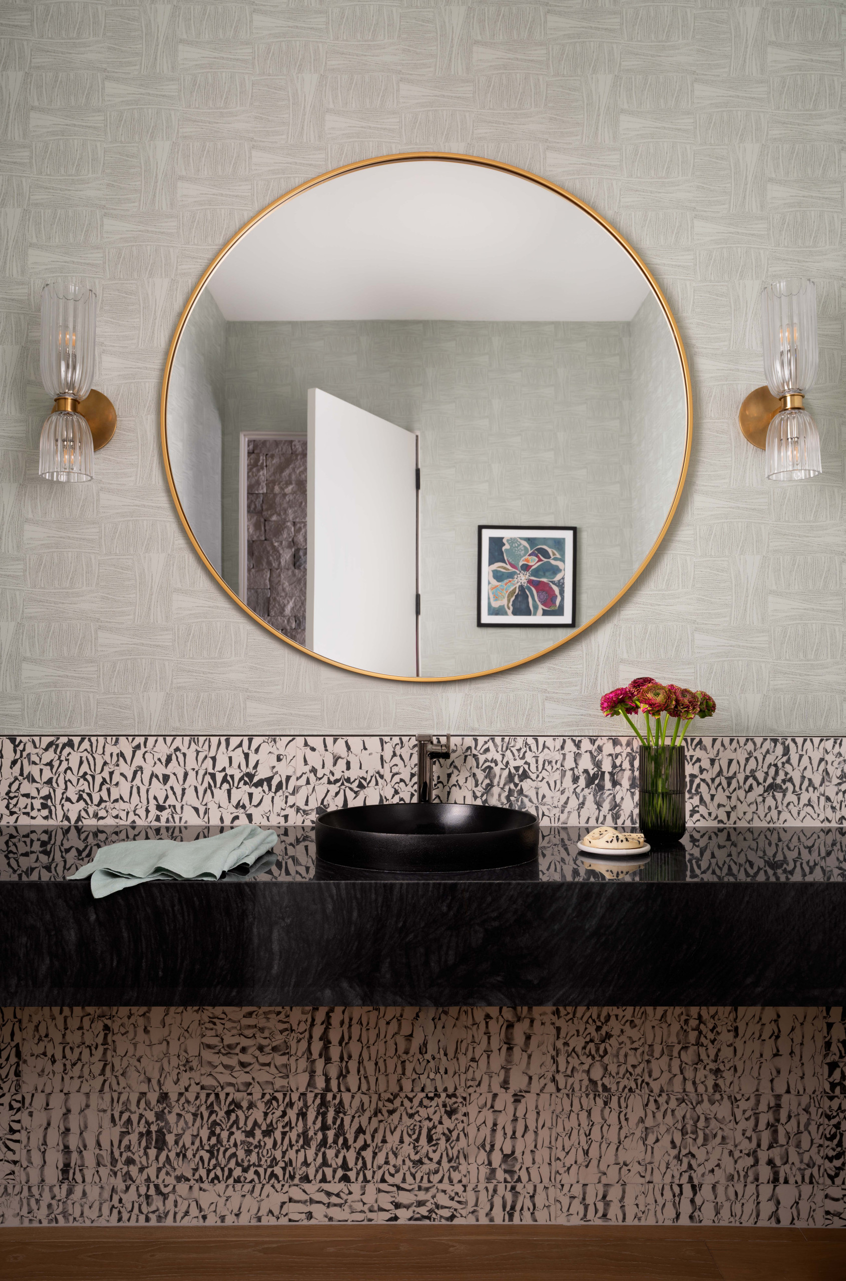 Lindahl played with scale in the powder room. “This might be my favorite room in the whole house,” she says. “The mirror is really big, about 4 feet in diameter, so you walk in and it wows.” The sconces have a reeded texture. “I love that these are heavier on top and lighter on the bottom. It’s an unexpected play on scale,” Lindahl says. The 8-inch depth of the countertop apron creates a strong black line across the wall.